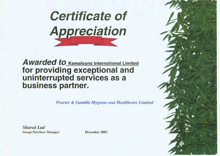 CERTIFICATE OF APPRECIATION FROM PROCTER & GAMBLE (USA)